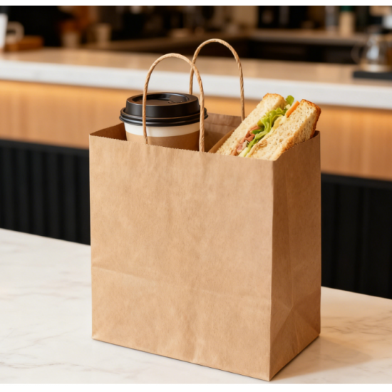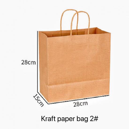 This kraft paper bag is our size 2 kraft paper bag. It's made of food-grade 115g kraft paper, making it sturdy and durable. It features a handle and is reinforced to withstand the weight of items, making it an excellent choice for packaging in the food service industry.