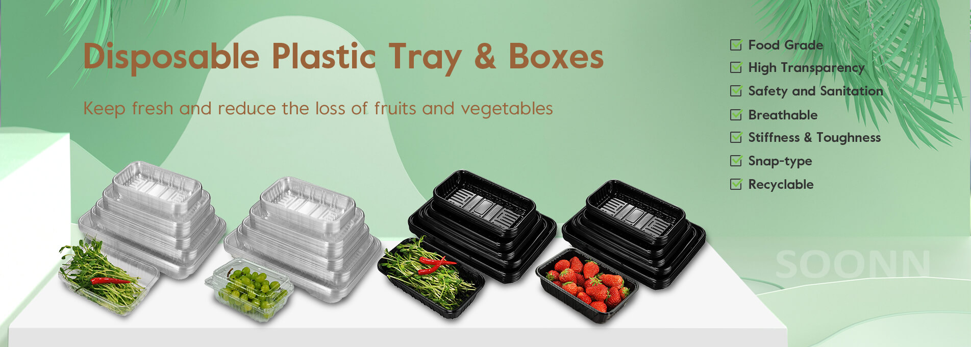 We mainly supply disposable PET fruit and vegetable trays,
