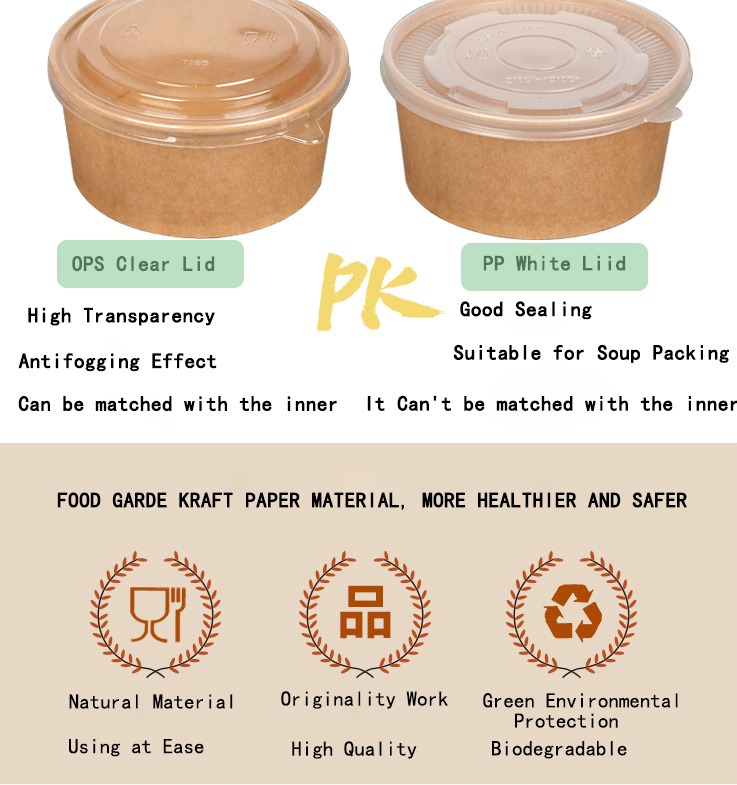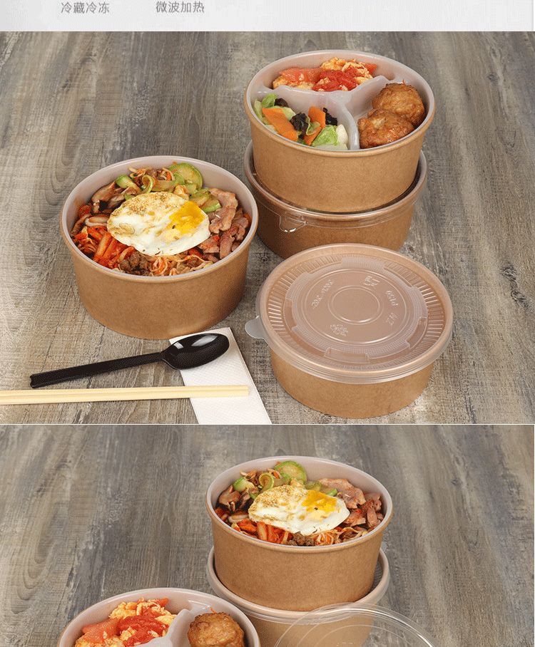 1.Thickend kraft paper round bowl:Food grade kraft paper material enviromental & health for food packaging.